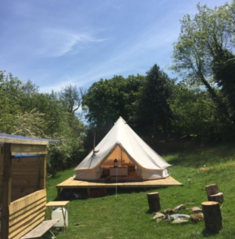 Accommodation on the land is available in a beautiful bell tent with a woodburner and proper double bed, or a funky converted Mercedes van, all with separate fully equipped kitchens, bathrooms, fire pits and hammocks.